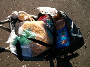 Item by item, I packed the bag. Heavy items went to the bottom, the lighter and crushable things on top. A grocery Tetris game. Sure enough, I was able to pack it all into the bag, minus the huge bag of pasta that I lashed to the top of the trailer. The look of confusion on the cashier’s face melted away to boredom. Can’t impress everyone.